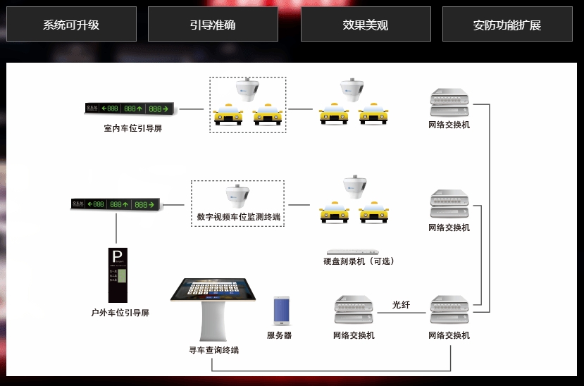 室内视频:视频车位引导系统采用在每个车位安装视频检测终端来判断当前车位状态,从而统计出当前车场空车位数,再通过引导屏的显示引导车主快速停车,后期可升级寻车功能实时提供剩余车位信息,为现代化智能停车场提供有效的管理方案.