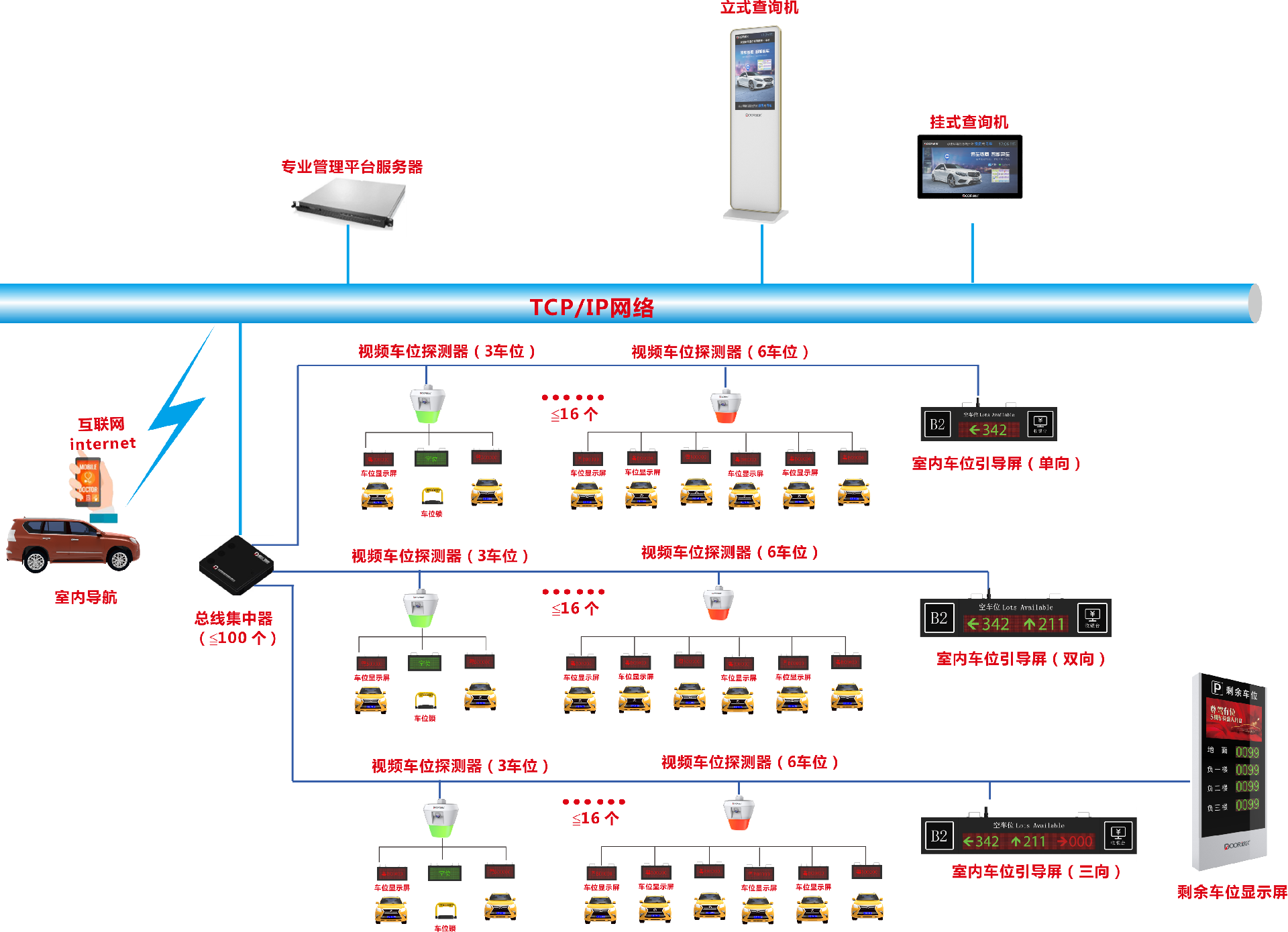 视频识别车位引导系统以视频车牌识别技术为支撑,在车辆进入停车场后,车主根据系统所提供的实时车位状态信息,通过引导指示,将车辆快速便捷的停至空闲车位!减少了因缺乏停车信息导致的车位难找情况,提升了道路通过率,提高了停车场的车位使用率,离开停车场时,通过在电梯口放置的反向找车查询机、微信公众号查询车辆,按规划的便捷路线导航取车,并根据室内引导屏出口方向指引,引导车主快速开车离场,解决了找车难和出口拥堵问题。