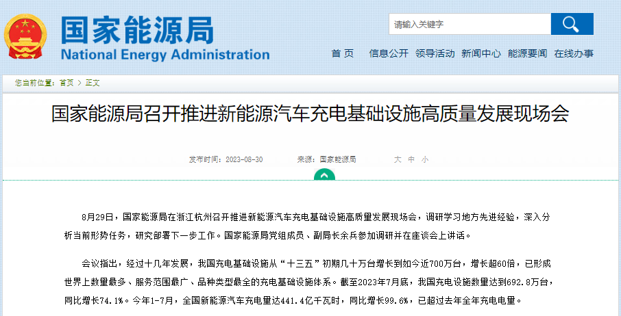 会议指出,经过十几年发展,我国充电基础设施从“十三五”初期几十万台增长到如今近700万台,增长超60倍,已形成世界上数量最多、服务范围最广、品种类型最全的充电基础设施体系。截至2023年7月底,我国充电设施数量达到692.8万台,同比增长74.1%。今年1-7月,全国新能源汽车充电量达441.4亿千瓦时,同比增长99.6%,已超过去年全年充电电量。